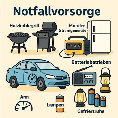 - Bevorratung von Getränken und haltbaren Lebensmitteln für einen Zeitraum von 10 bis 14 Tagen und kritische Auseinandersetzung mit den Informationsschriften des BBK zur Notfallvorsorge, was persönlich benötigt wird
