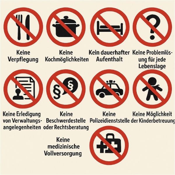 Wir müssen Sie aber darauf hinweisen, was Sie beim Notfall-Infopunkt nicht bekommen. Das soll ein Anhaltspunkt dafür sein, wie Sie Ihre Eigenvorsorge ausgestalten müssen. Folgendes gibt es *NICHT* am Notfall-Infopunkt in Bargfeld-Stegen: