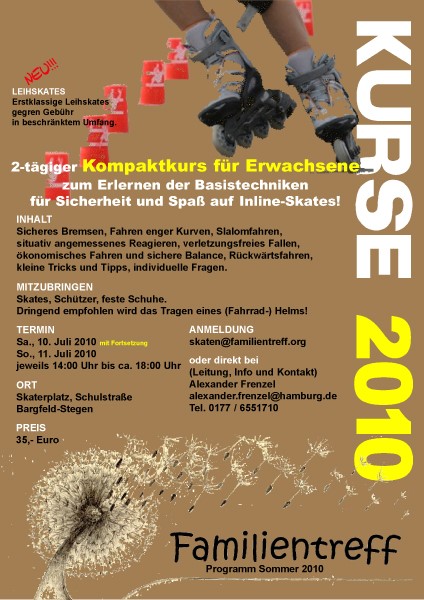 Nach dem Erfolg der vergangenen Jahre organisiert der Familientreff e.V. auch in diesem Jahr 2-tägige Skate Kurse für Kids und für Erwachsene zum Erlernen der Basistechniken, für Sicherheit und Spaß auf Inline-Skates!